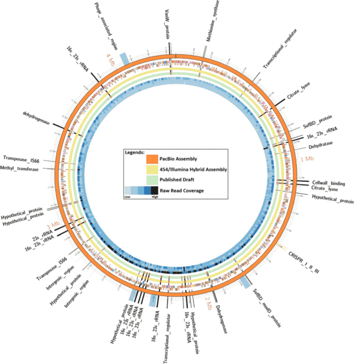 The advantage of SMRT long reads, which can overcome the problem of abnormal GC and high duplication of bacterial genomes, often assembled into a single contig. Among all assemblies, the PacBio assembly recovered the highest number of core and virulence proteins, and housekeeping genes based on whole-genome multilocus sequence typing. It is easier to achieve complete assembly or fine map, and help you rapidly advance your research to explore the genetic structure and functions.